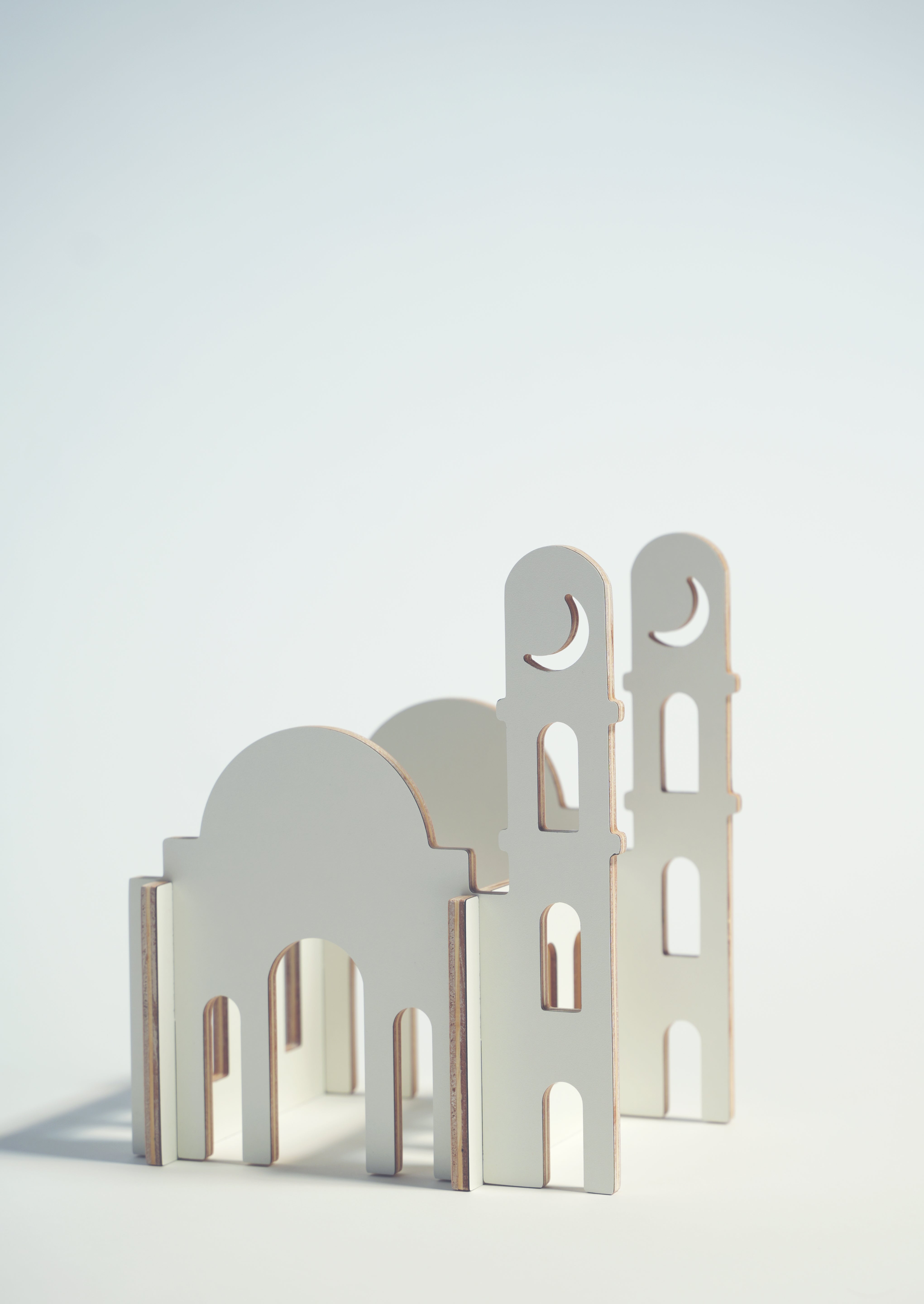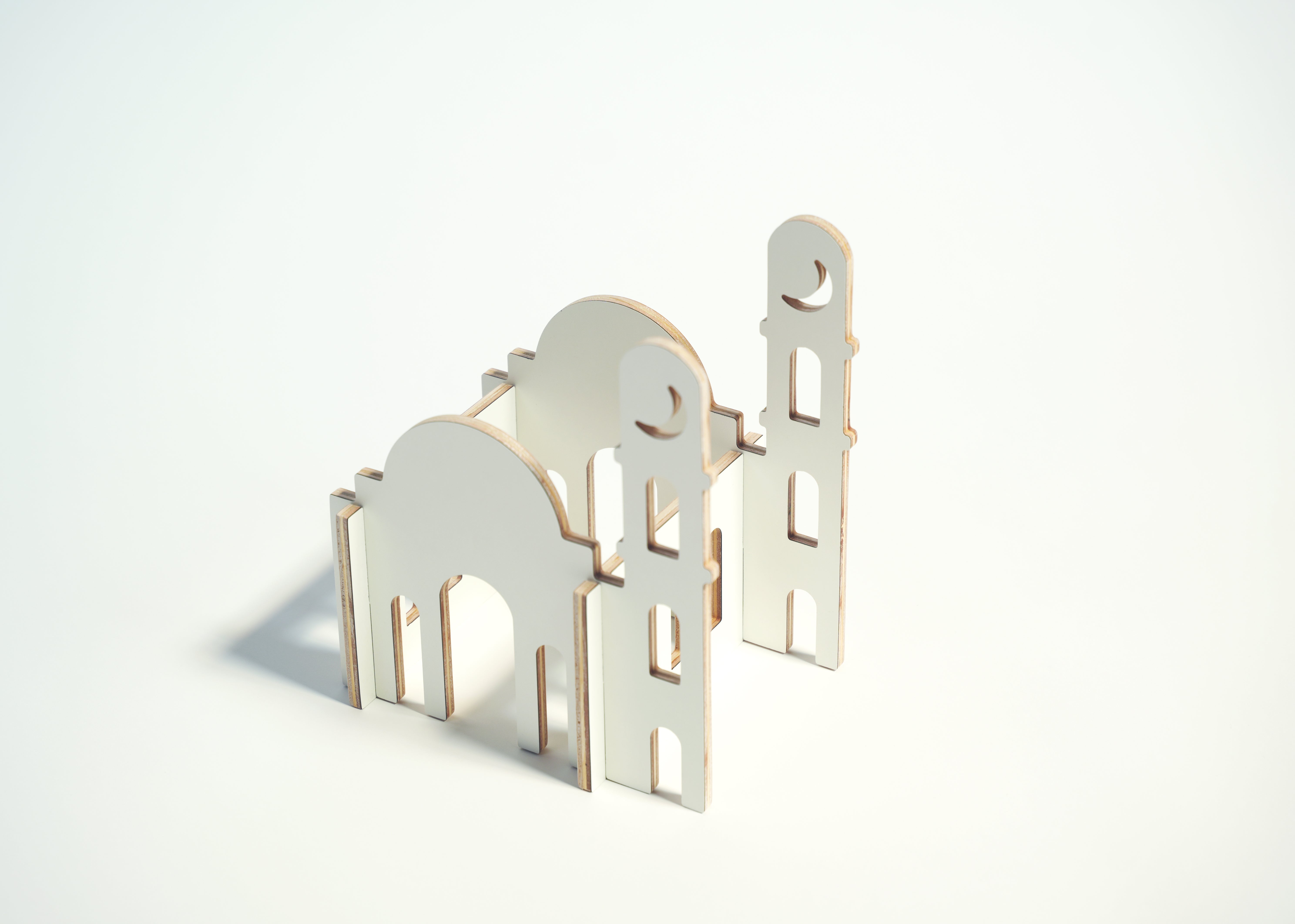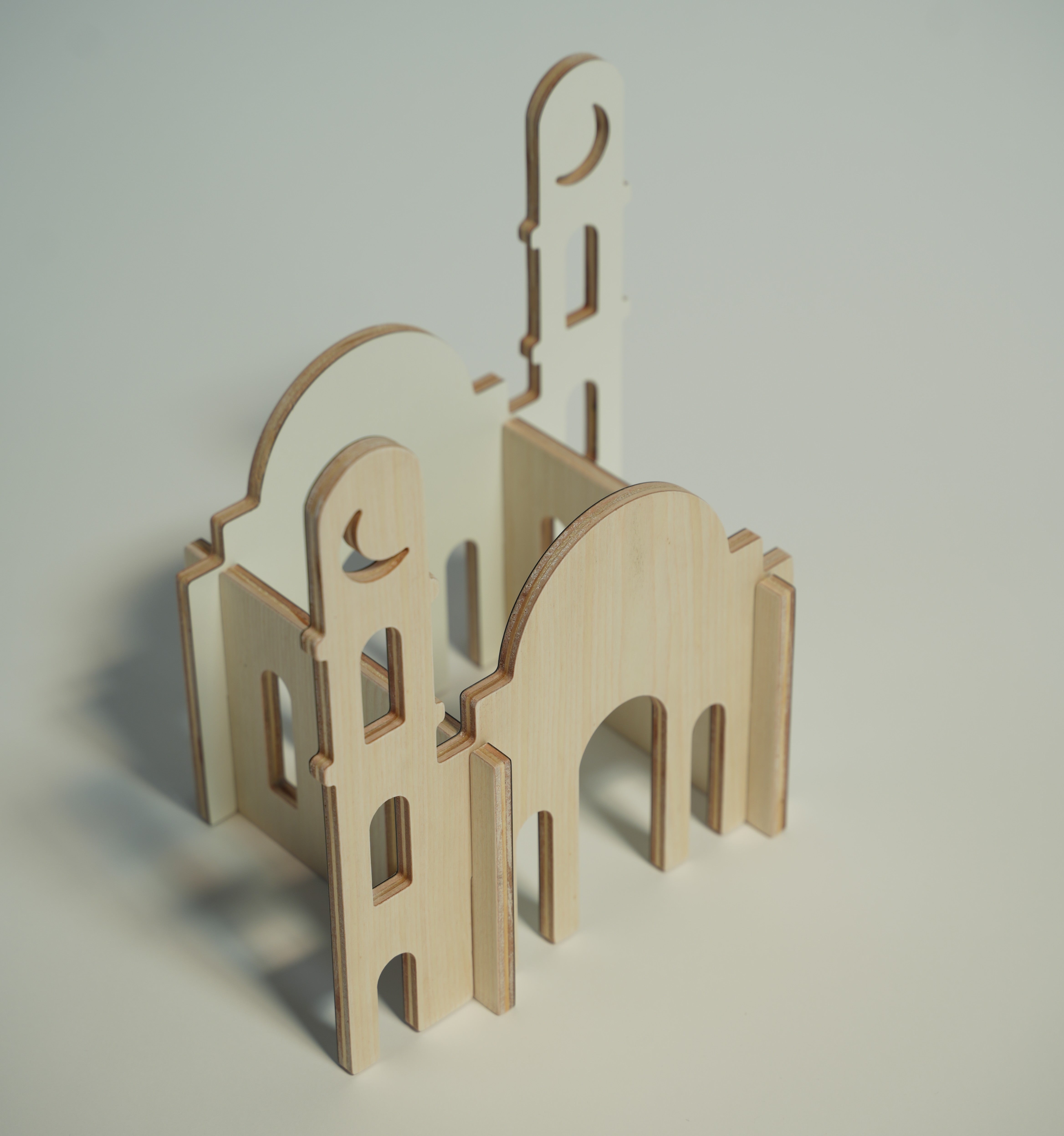 Crafted from sustainable plywood with child-friendly materials, the Masjid features 4 double sided pieces in White and natural wood. Its flatpack, easy to build, store, transport, and rebuild at any time.